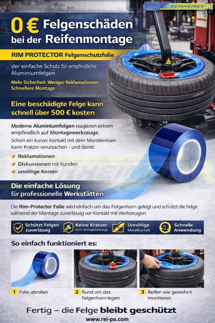 Die RIM PROTECTOR Felgenschutzfolie schützt empfindliche Felgen zuverlässig während der Reifenmontage.