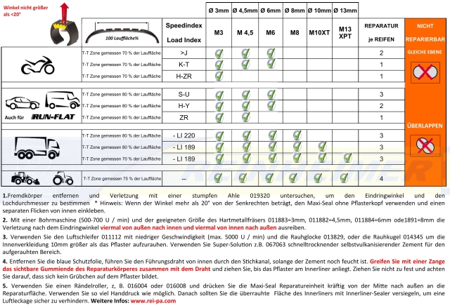 Reifen ist danach wieder uneingeschränkt, entsprechend der Reifendaten, einsetzbar.Eine fachgerechte Reparatur schränkt